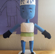 This is my "mini me" puppet. She has a balsa wood and wire armature. Her head is also balsa wood. Her skin is fabric. Her hair is wired felt. Her mouth shapes are painted paper. The eyes and eyebrows are epoxy putty. Her shirt is sewn fabric. Her glasses are made from wire.